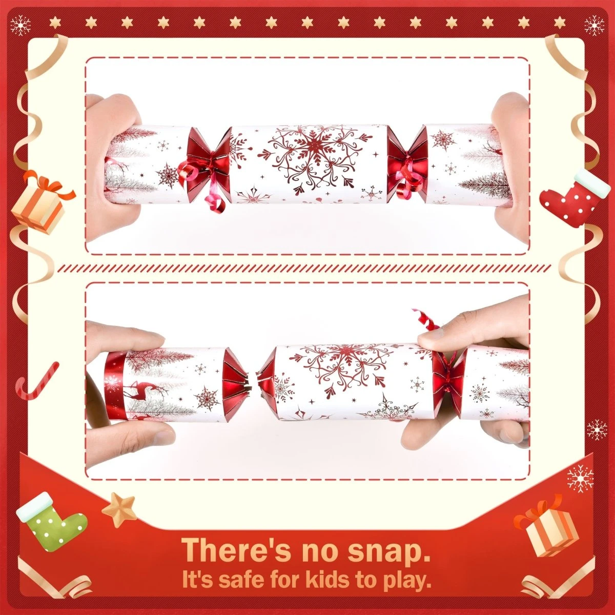 - All-Ages Fun: Our Christmas no snap party favors and Christmas no-snap party table favors are designed for both kids and adults, ensuring everyone filled with surprises and entertainment, Our product’s box, no-snap party favors and the gift inside are made from safe and high-quality material.