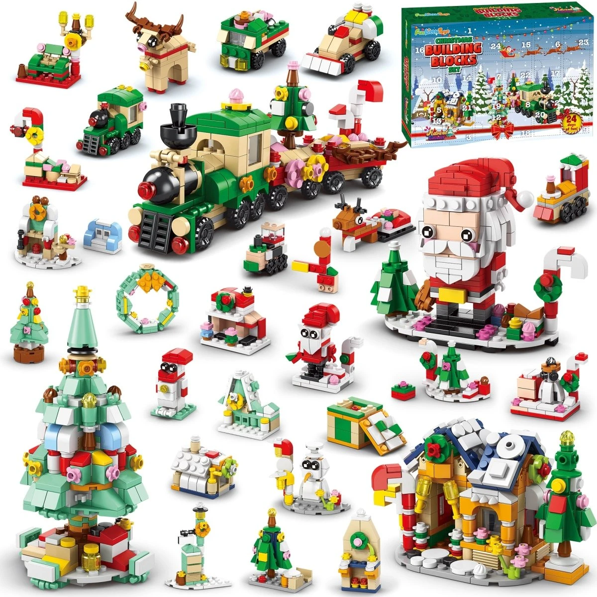 - ย Variety of Models: Our calendar includes a diverse range of holiday-themed models, from Santa Claus and reindeer to Christmas trees, gingerbread houses, and more. The 24 shapes can be individually assembled into 4 large shapes but can’t be built at the same time.