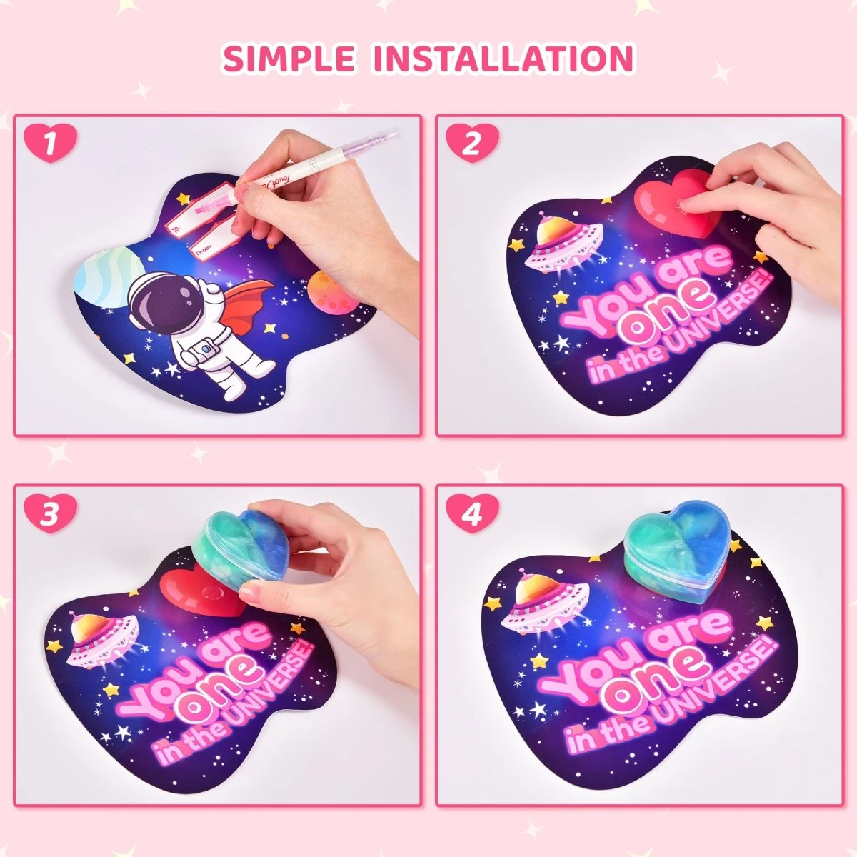 - Unique & Colorful Design: Each heart-shaped galaxy slime is made with a tri-color blend and small glitters, creating a mesmerizing visual effect. Paired with 7 designs of valentine’s cards, they make the perfect match.