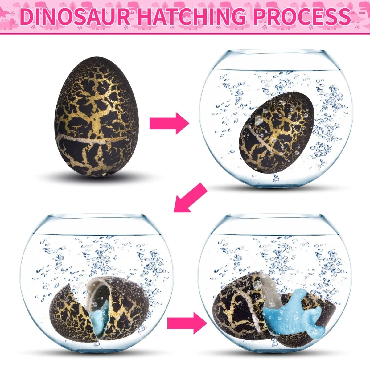 - Fascinating Hatch: Place the dinosaur eggs in water for 24-72 hours to witness them hatch and grow into small rubber dinosaurs. The longer they stay submerged, the larger they grow.