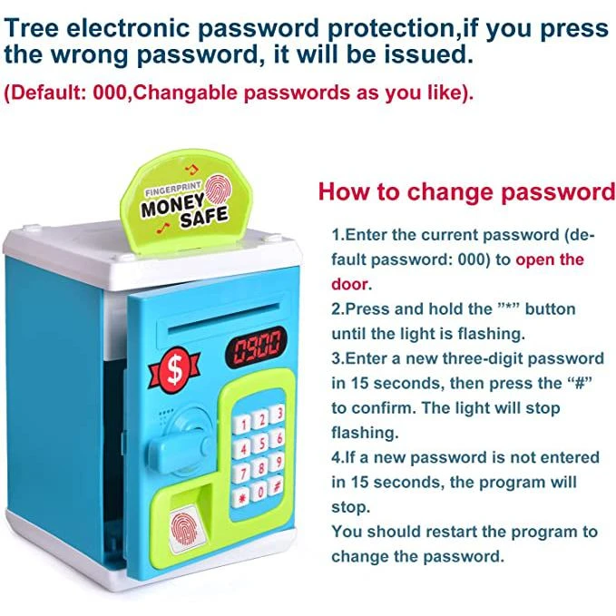 Learning through play: this electronic piggy bank is the best pretend play toy for toddlers and big kids to learn and develop money-saving abilities. It will ask them to enter a password to mimic the real-world money transaction experience. The process of inserting money/coins into the vault helps your kid to train fine motor skills that trigger brain development. On the other hand, it is also a great opportunity for young children to learn the numbers and the value of money by recognizing denominations.