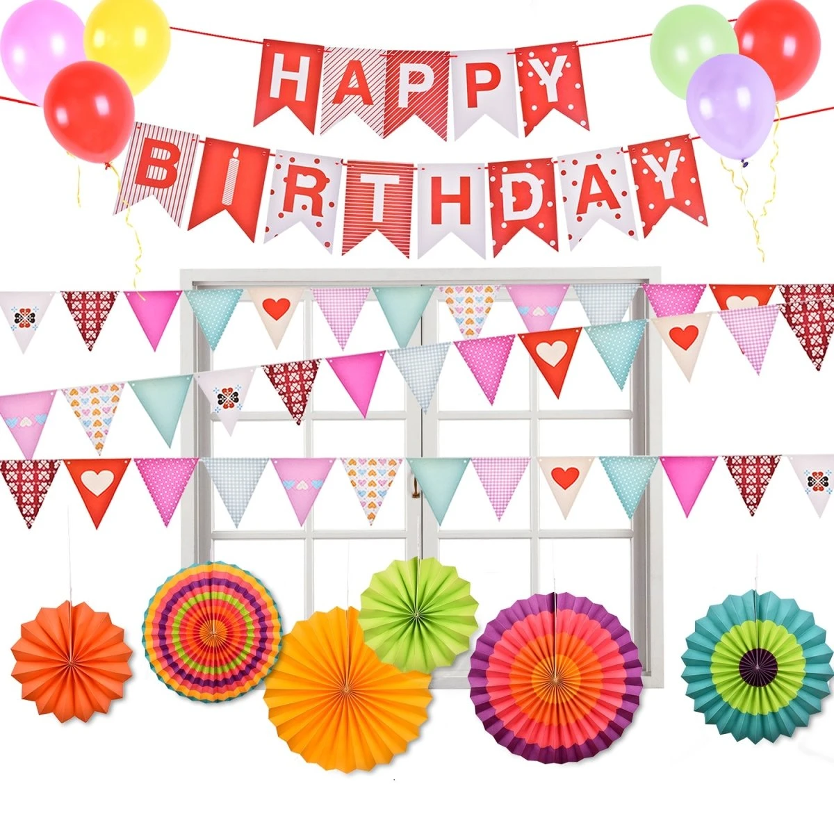 Party decorations include 12 counts of 9โ colorful party balloons, 2 counts of 6.6 ft silver string, 1 pack of birthday confetti, 6 counts of colorful paper fan, 3 packs of paper flags with 13 counts of flags in each pack