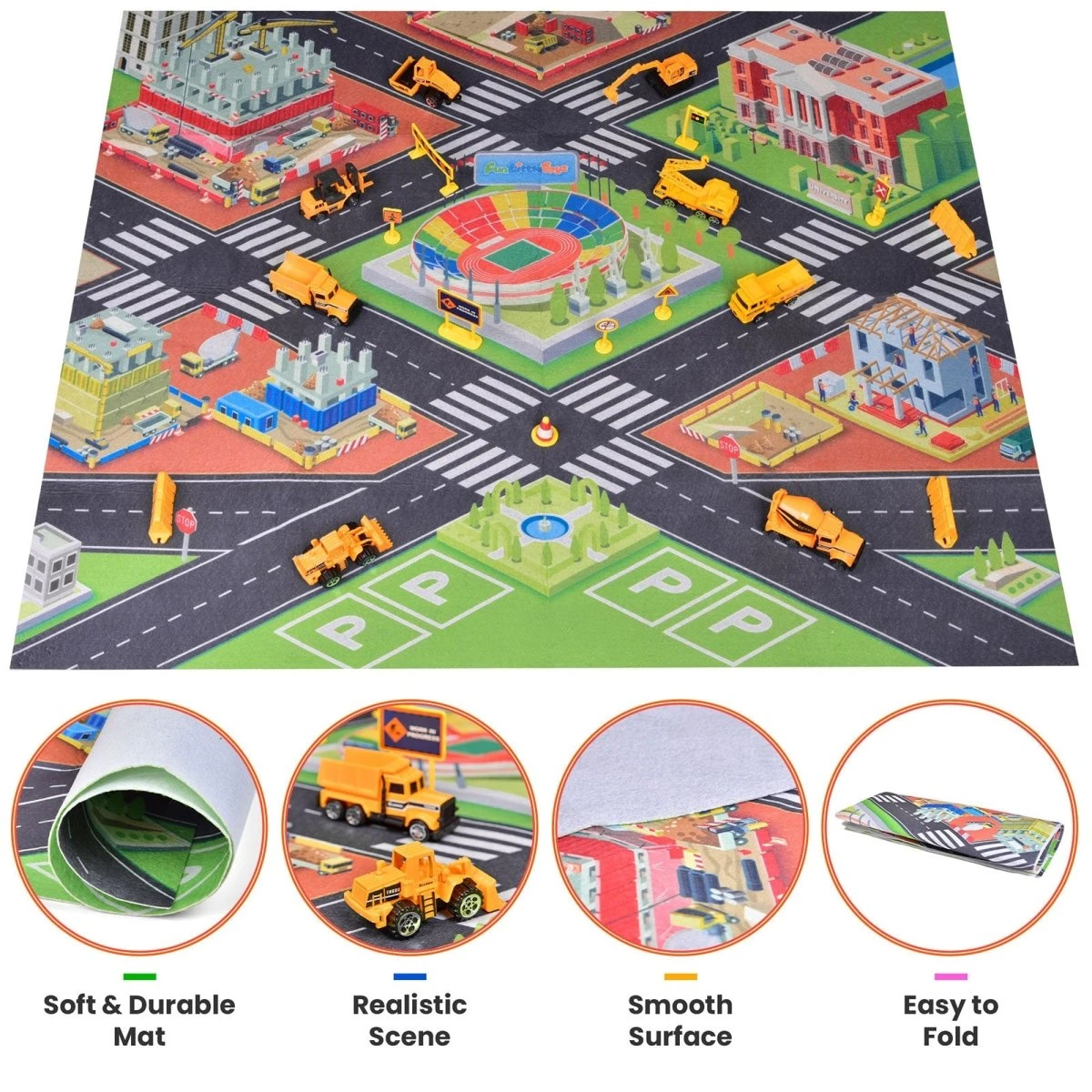 - Construction Vehicle Playset: The set includes 22 pieces, including an Excavator, Crane, Forklift, Dumper, Road Roller, Cement Truck, Haul Truck, Bulldozer, and a detailed play mat to create a realistic construction site.