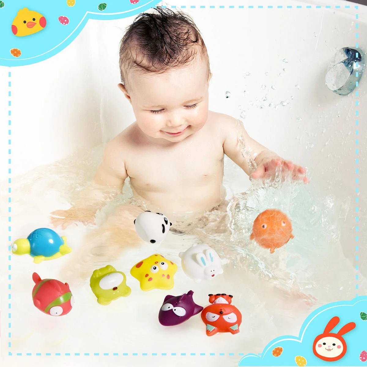 - Ocean Animal Toy Set: 12 Adorable Ocean Animal Bath Toys, including a squishy rabbit, panda, starfish, baby fish, carb, shark, turtle, whale, owl, bear, and a puffer fishย