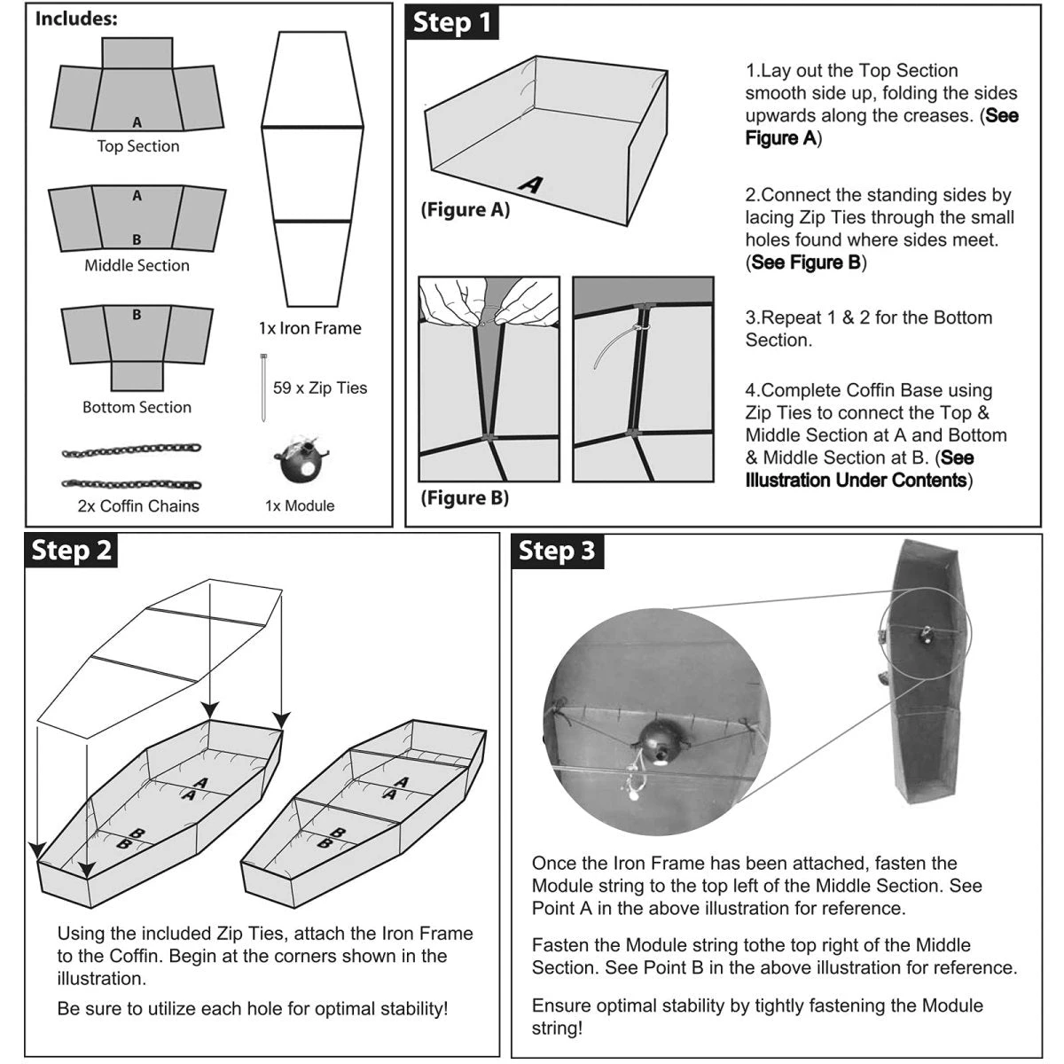 - Instructions Included: Including detailed step-by-step instructions on how to assemble this awesome life-sized coffin. Each section of the coffin should be fastened together with the included 59 zip ties. The iron frame should be placed on the connected sections for optimal stability and security.ย