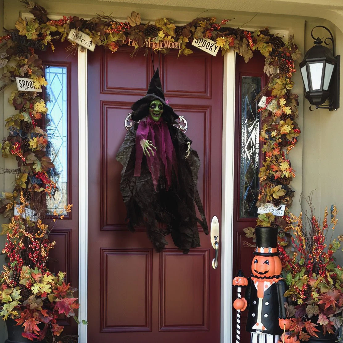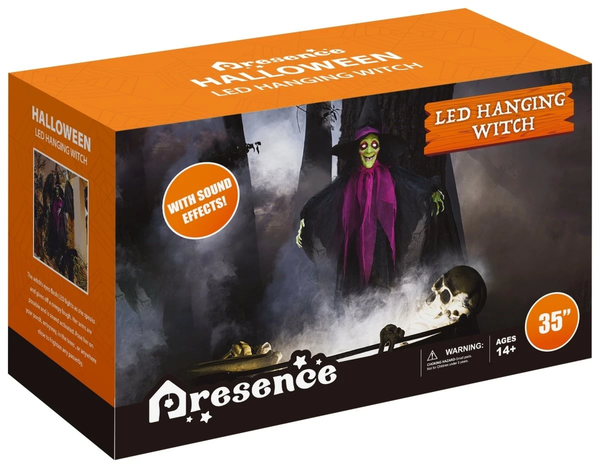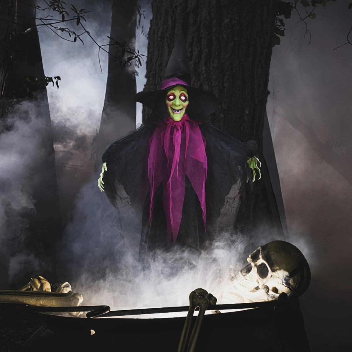 - Animatronic Excitement: This Halloween hanging witch is easy to excite. Thatโs right โ itโs animatronic! Bound to bring fright & delight wherever it decides to hang out that night, friends and family are promised to feel the excitement when the Halloween Witch sounds out a wicked laugh as someone walks by
