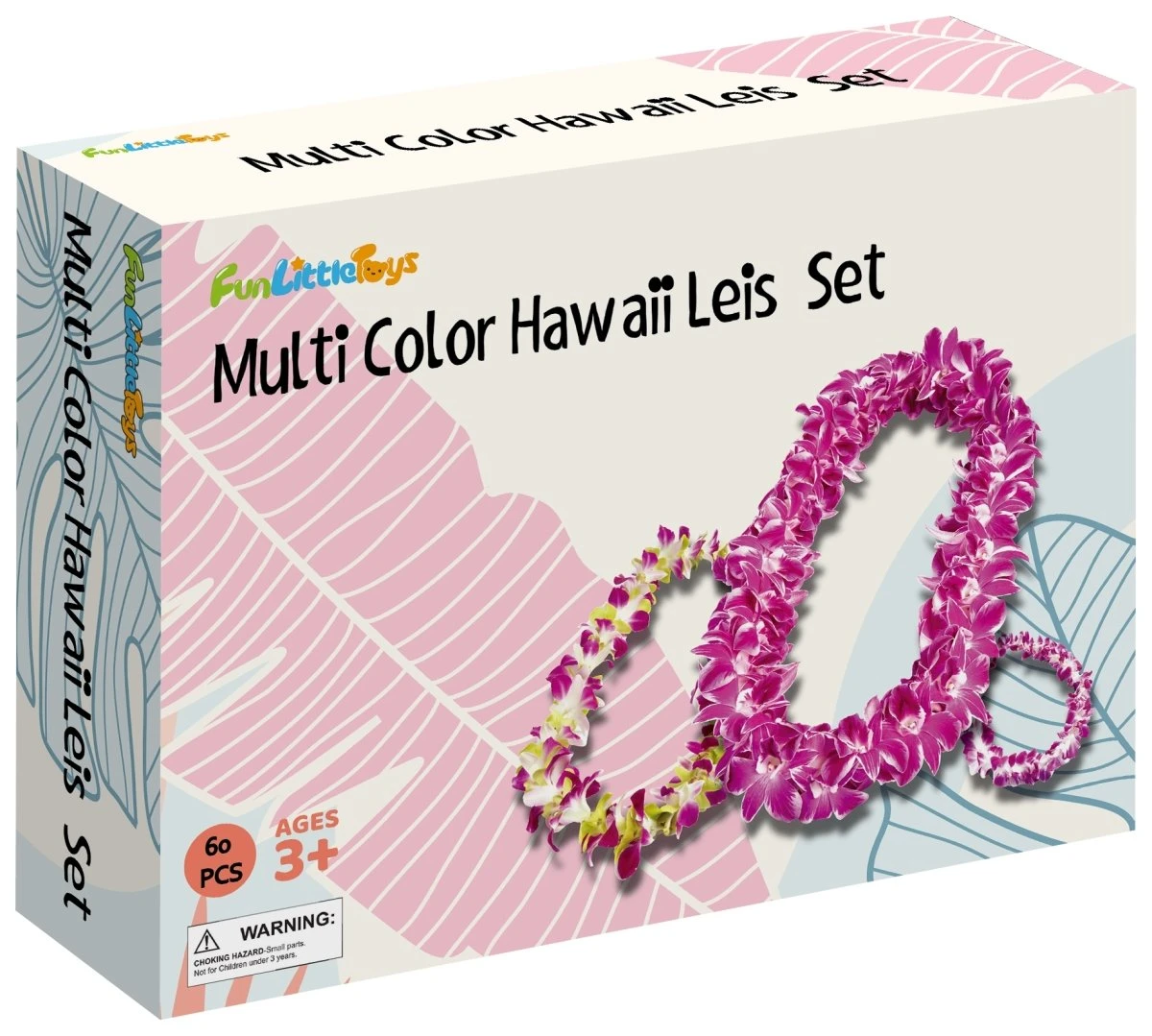 The Hawaiian Leis Necklace Bracelets from Fun Little Toys featureย 60 Party Pieces for the whole neighborhood to enjoy! Thisย product includesย three different sizes of flower leis to be worn as wristbands, headbands, or neck garlands. There are 20 leis necklaces, 20 leis headbands, and 20 leis bracelets included in this set.