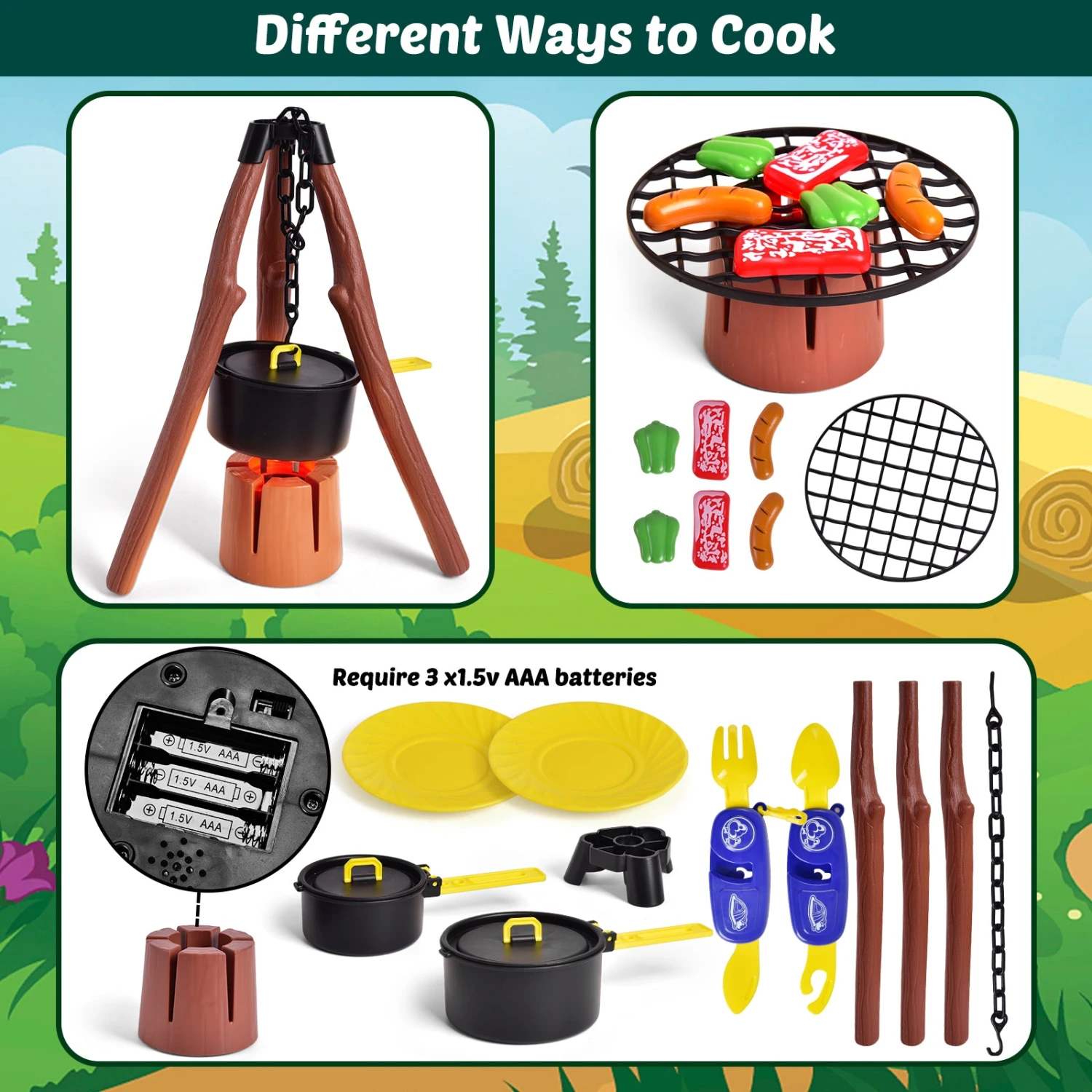 Camping Accessories: A miniature fishing rod, canoe, cooking pot, and other camping gear to encourage pretend play.