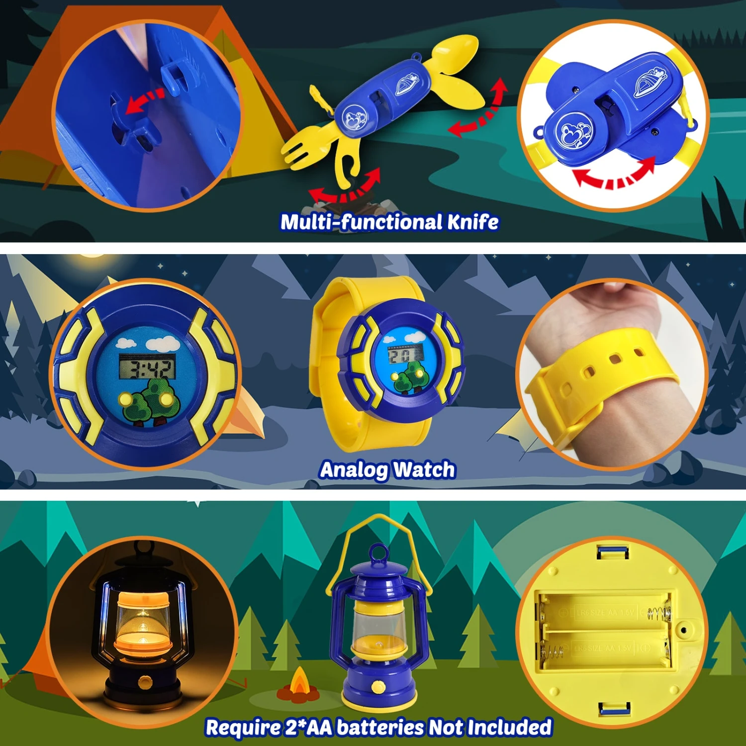 Camping Figurines: Four adorable, poseable adventurer figures, each with their own camping gear like backpacks, binoculars, and a flashlight.
