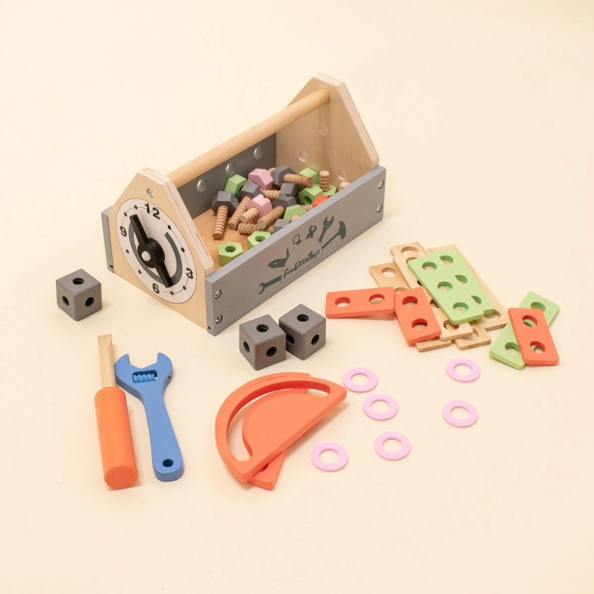 Everything-You-Need Toolset: This pretend play toy tool set has a total of 45 pcs, including a wooden tool storage box, screwdriver, wrench, wooden screws, long wooden screws and nuts, 3 connectors, play protractors, two-hole wooden tiles, three-hole wooden tiles, four-hole wooden tiles, five-holed wooden tiles, and one toy tool box.