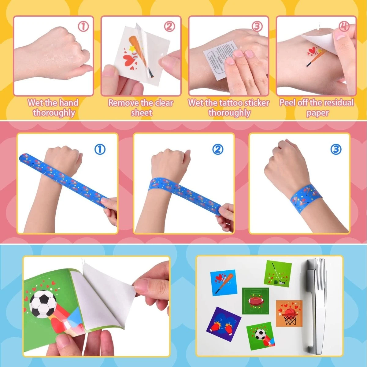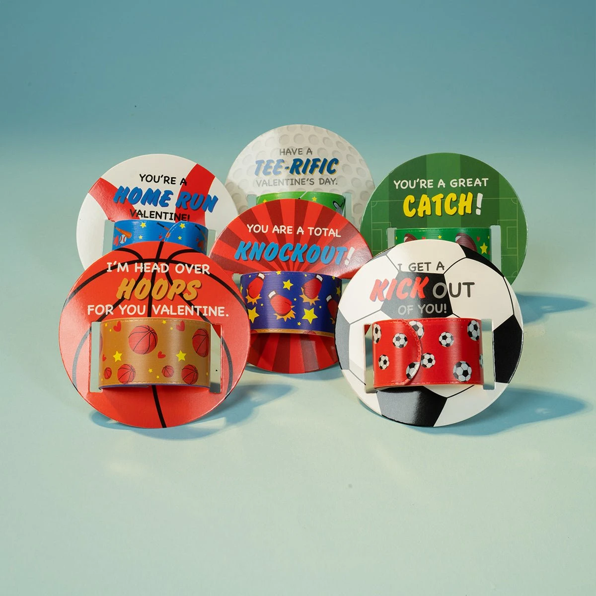 Super Value Pack: The Valentine’s Party Pack includes: 30 Slap Bracelets, 60 Stickers, 30 Temporary Tattoos, and 30 Valentine’s Cards. We have designed 6 unique sports ( Football, Basketball, Baseball, Golf, Soccer, and Boxing) elements for each category of accessories!