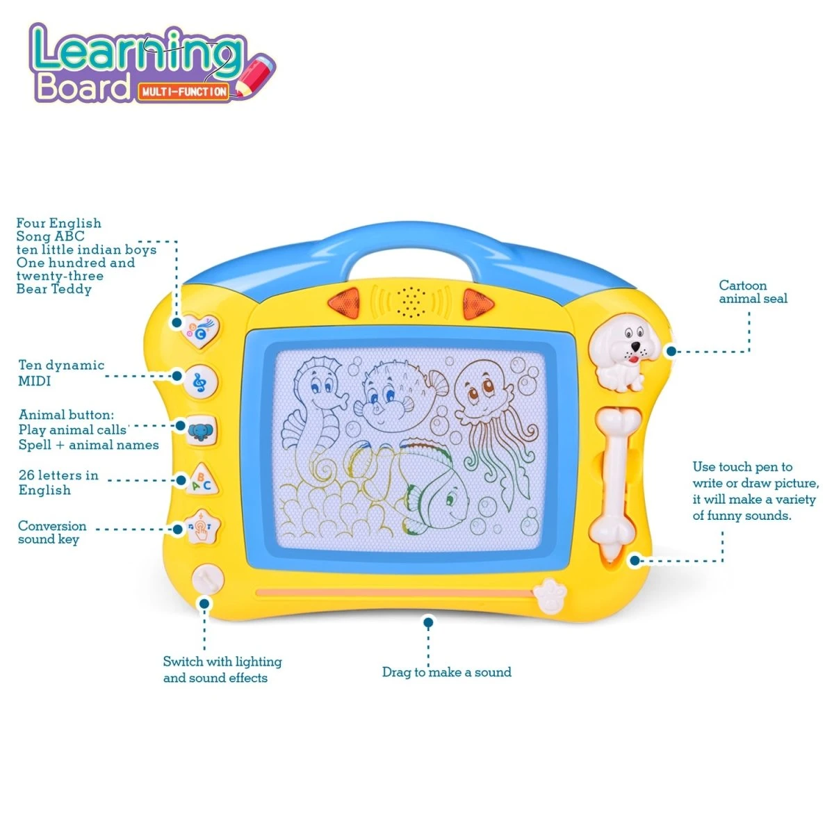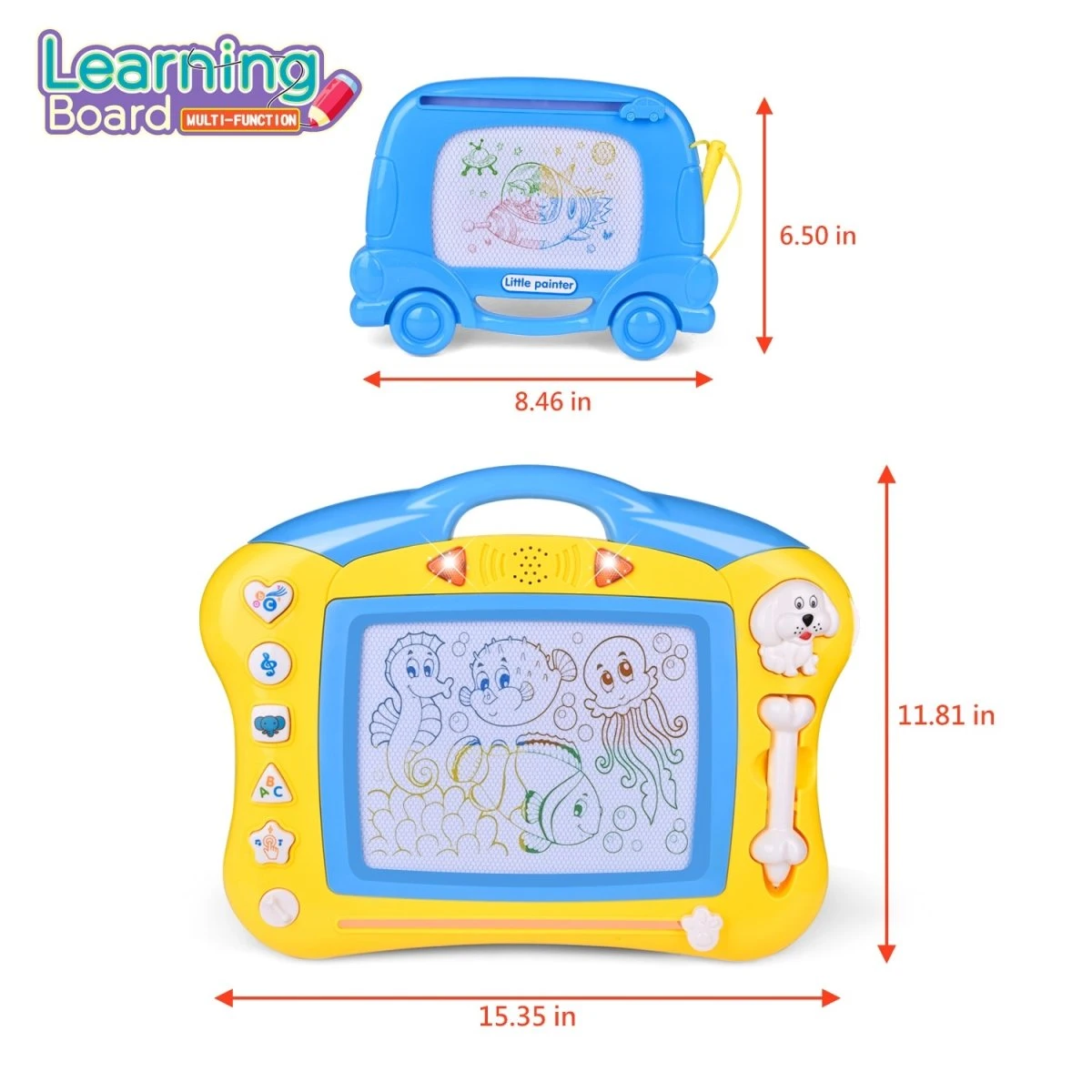 - Lights & Sounds: Musical magnetic drawing board, measuring 15.35″ inches long and 11.81″ inches high, activates different tones and lights