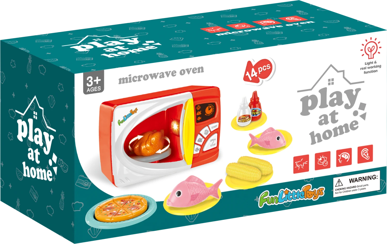 Kid Chef, hereโs all you have to work with: 2 play-fish, 2 play-corns, 1 play-pizza, 1 play-chicken roast, 2 play-condiments, and 4 play-plates! And of course, this being the Microwave Oven Toy Set, Kid Chefโs very own Microwave Play-Oven is right there. Time to get cooking! Pop any of the food items on a plate and press that big button to get the microwave open! Close the cooking door once youโve loaded up the play-food, press the button showing your particular meal, and press start! Yes, Kid Chef, this microwave acts just like a real one โ the lightโs turned on and the food is spinning around and around. Cook up anytime in an exciting and engaging way with this play kitchen, Kid Chef! All thatโs required to power this entertaining path to play food fun is 3 AA batteries, and the fun-gineering mind of a little chef!ย