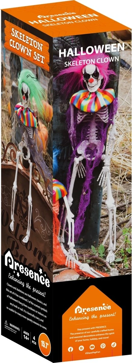- Value Pack: 4 Full-Bodied Skeletons Covering the Total Skeletal Structure. Measuring 15.7″ inches in length, each Clown Skeleton is Dressed in the Freakiest Carnival Fashion.