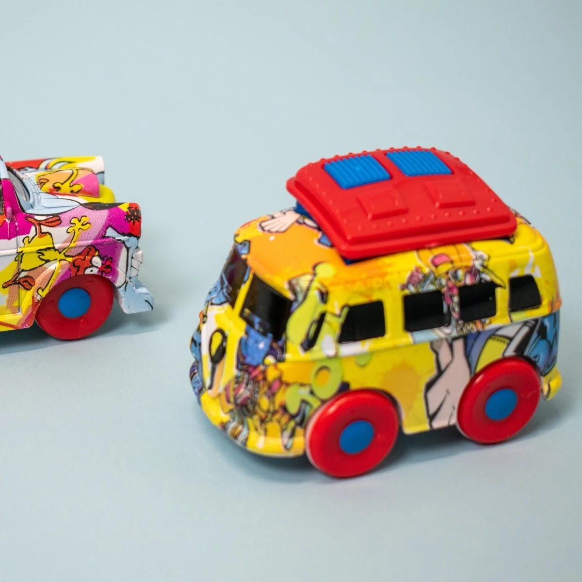 There are 1…2…3…4 Comic Cars in this graffiti art car toys bundle at your disposal: Muscle Car, Station Wagon, Oldschool Bus, and Dune Buggie. Thatโs plenty of Comic Car choice right there. These toy cars have friction-powered technology that PopFun-gineers are proud to call the best in the west! When the race begins, simply pull these fun little toys back and let โem rule the road – look and see, these cars for kids never get old! Kid Racer, keep your eyes peeled and behold these eye-catching comic book designs. Itโs graffiti art done smart! Donโt worry about bumping these cars, theyโre designed to get themselves out of a jam in a snap. At this awesome value, get on board with a race car thatโll travel with Kid Racers long and far!