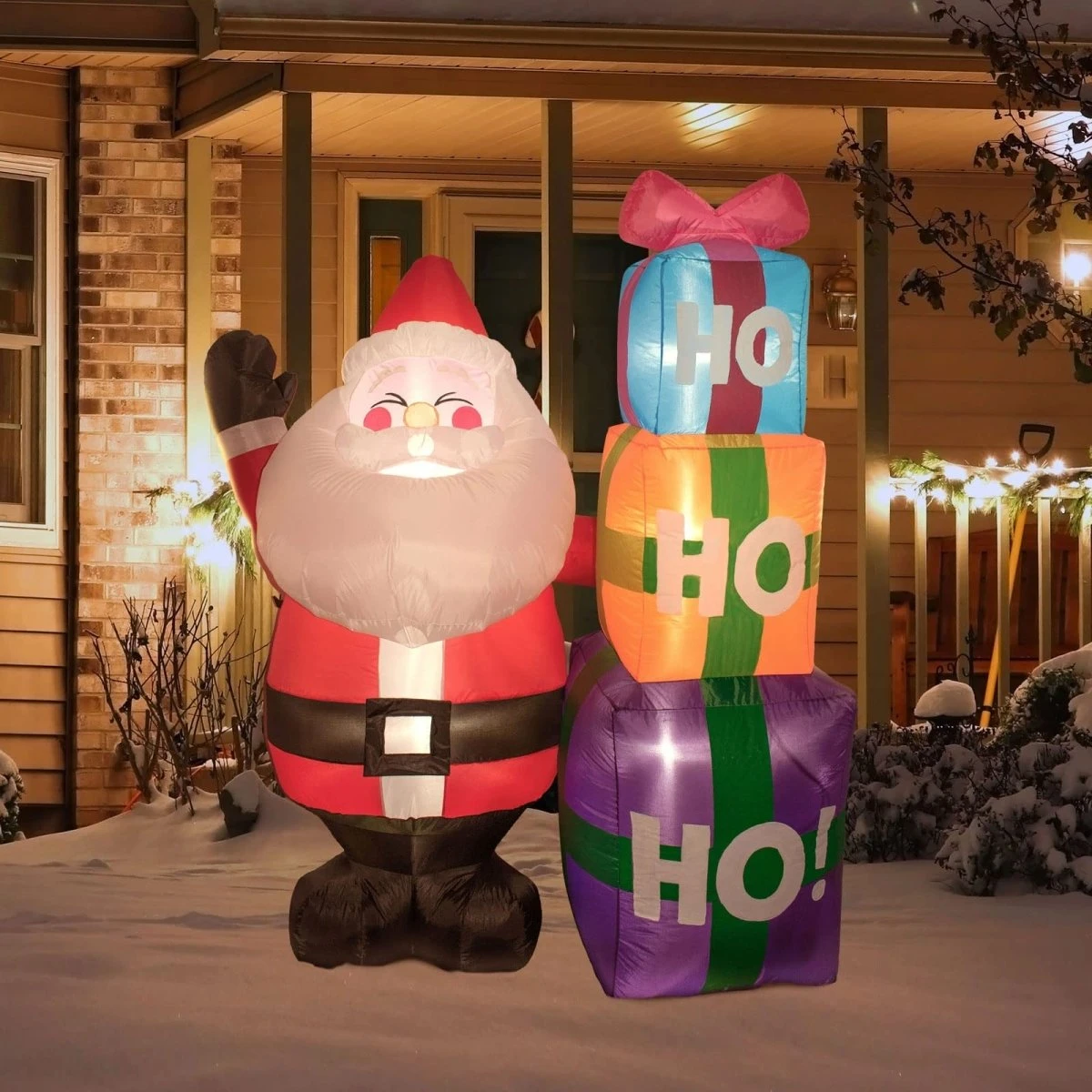 - Fun and Cute Design: Featuring 1 Waving Santa standing next to a stack of 3 Giant Christmas Gifts. This quality Christmas décor measures out to an incredible 6’ Feet in Height