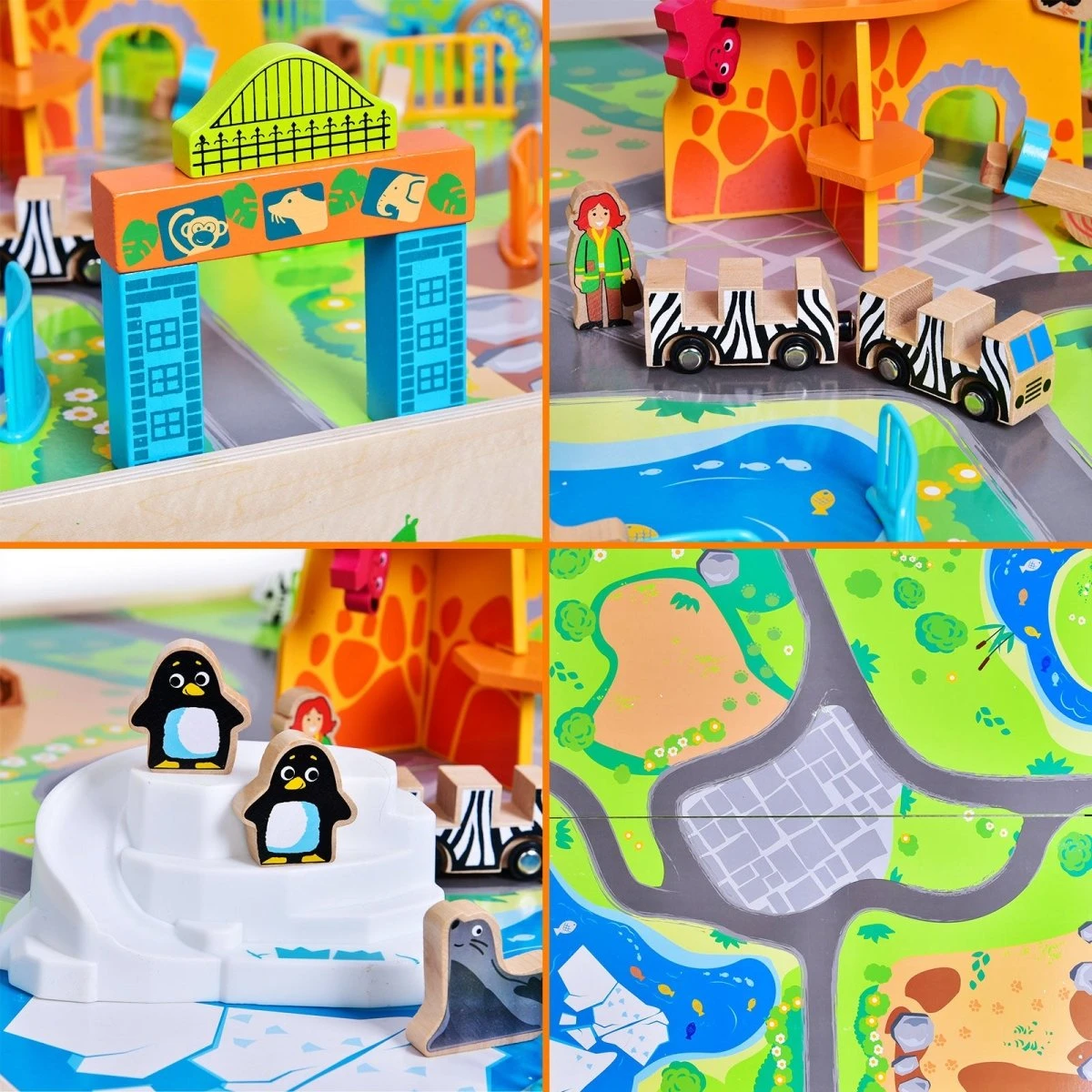 High Engagement: This large wooden table set has several scenes for different animals. There are jungle animals lions, sea animal penguins, and other safari animals such as giraffes, elephants, and parrots. Includes a seesaw and jungle train for the zoo!